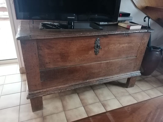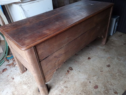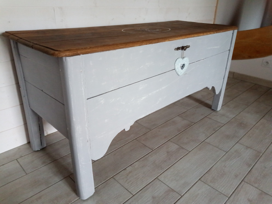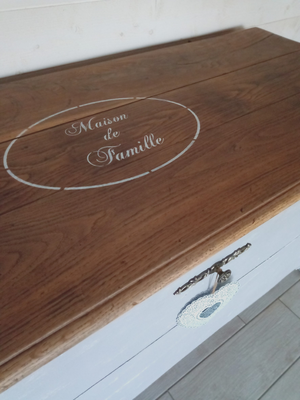 Maie relookée en gris "minéral" effet usée et plateau en bois naturel avec son pochoir
