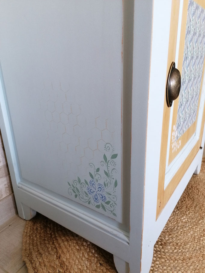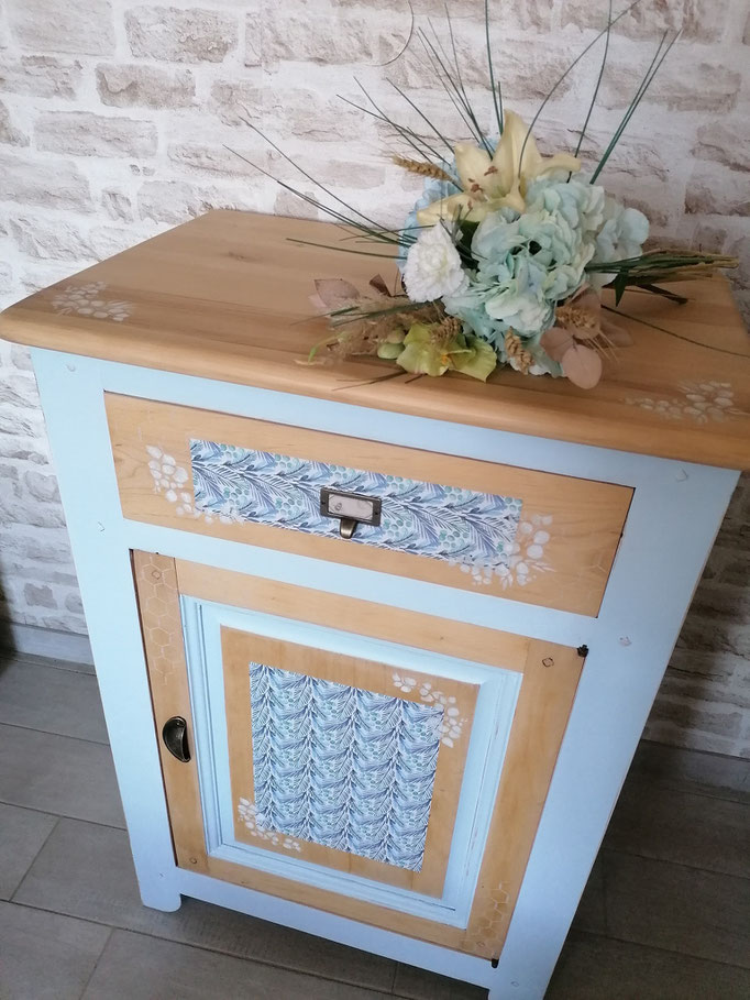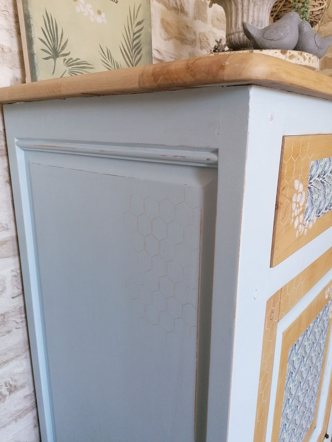 Confiturier déciré puis relooké en "tramontane" et bois naturel effet usé. Pochoir sur le dessus